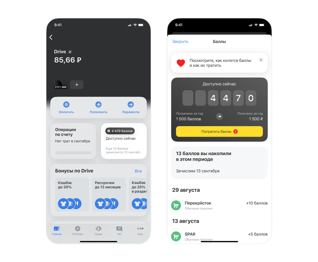 Не начисляем баллы за переводы, снятие наличных, пополнение карты, а также за транзакции по азартным играм и некоторые другие виды операций. Условия программы лояльности Drive PDF