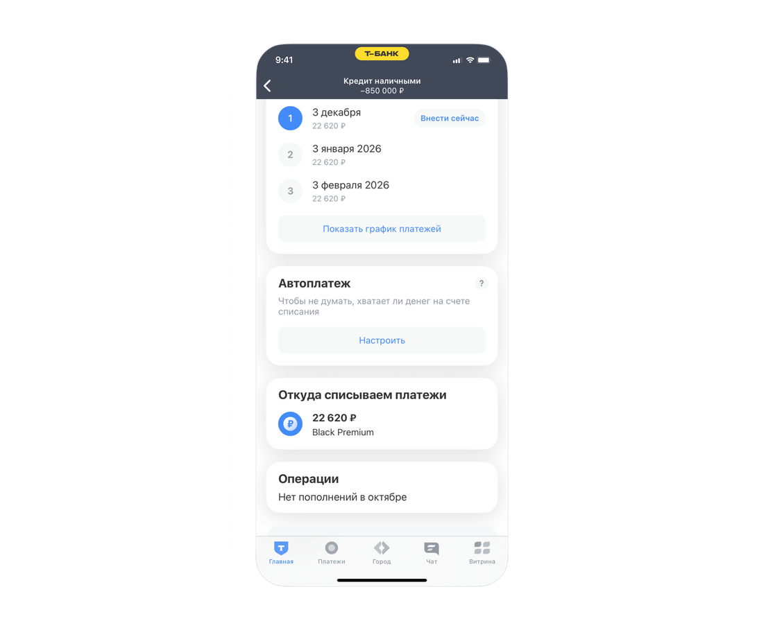 Если вы возьмете кредит в Т‑Банке, регулярные платежи по нему будут равны между собой, а еще их будут списывать в одно и то же число каждого месяца. Такой тип платежей называется аннуитетным, с ними проще планировать свой бюджет, так как со временем сумма и дата списания не меняются.