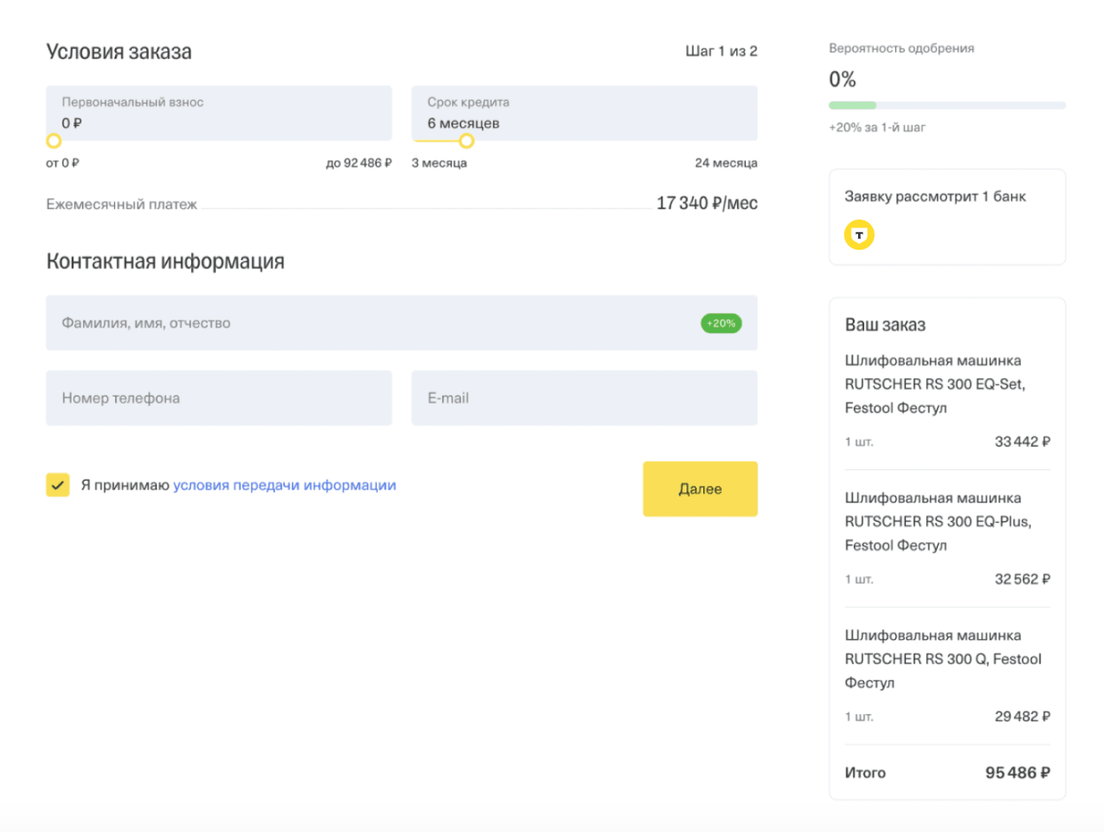 100tool решил подключить кредитование с оплатой по ссылке. После этого покупатели, которым было слишком дорого платить за инструмент всю сумму, смогли разбить стоимость на части. Оставить заявку на рассрочку или кредит и оплатить при этом можно из любой соцсети и мессенджера. Менеджер присылает ссылку на заявку, а покупатель заполняет ее за пару минут.