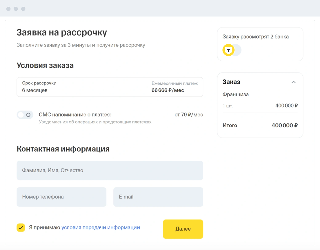 Рассрочку на франшизу можно подключить в Т‑Рассрочкуе — это сервис по оформлению рассрочек и кредитов для покупателей. Он работает с несколькими банками, позволяя клиентам бизнеса покупать франшизу в рассрочку.