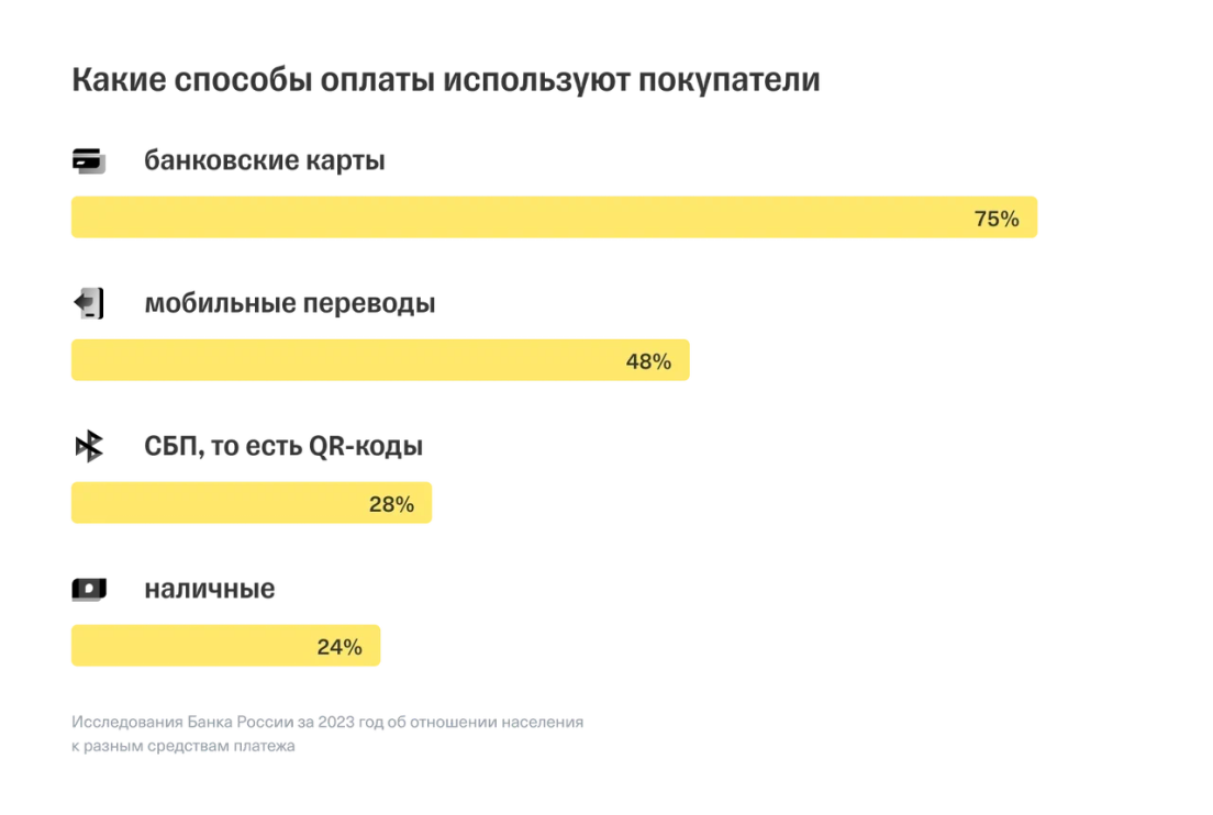 QR-код стоит подключить как дополнительный способ приема платежей. Одним клиентам удобно платить картой, а другим — наличными или по СБП.