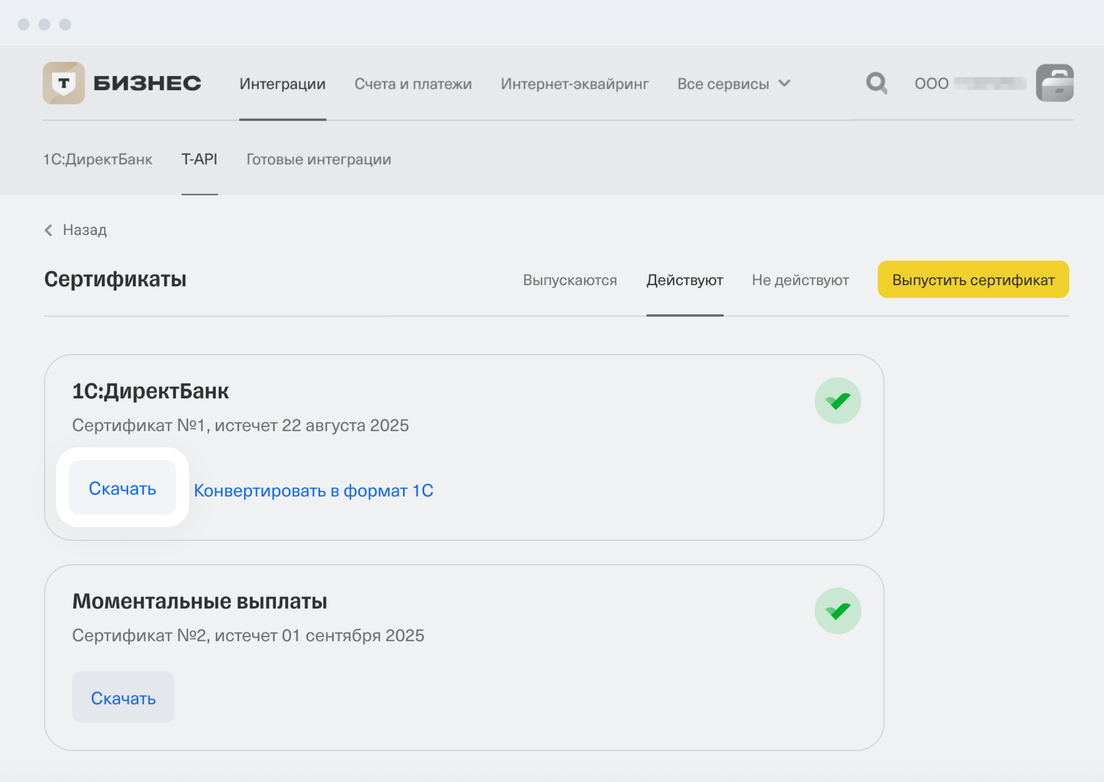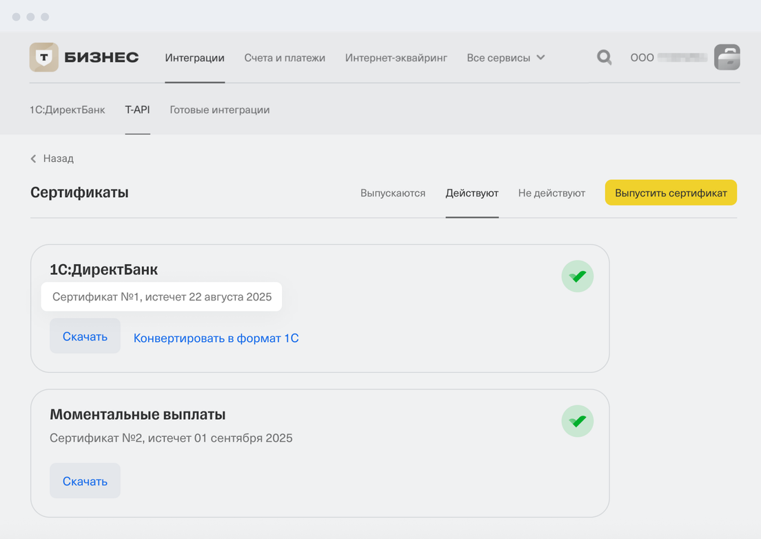 Все выпущенные сертификаты действуют 1 год и хранятся в личном кабинете Т-Бизнеса. Чтобы их посмотреть, откройте «Все сервисы» → «Интеграции» → «T‑API» → «Сертификаты».