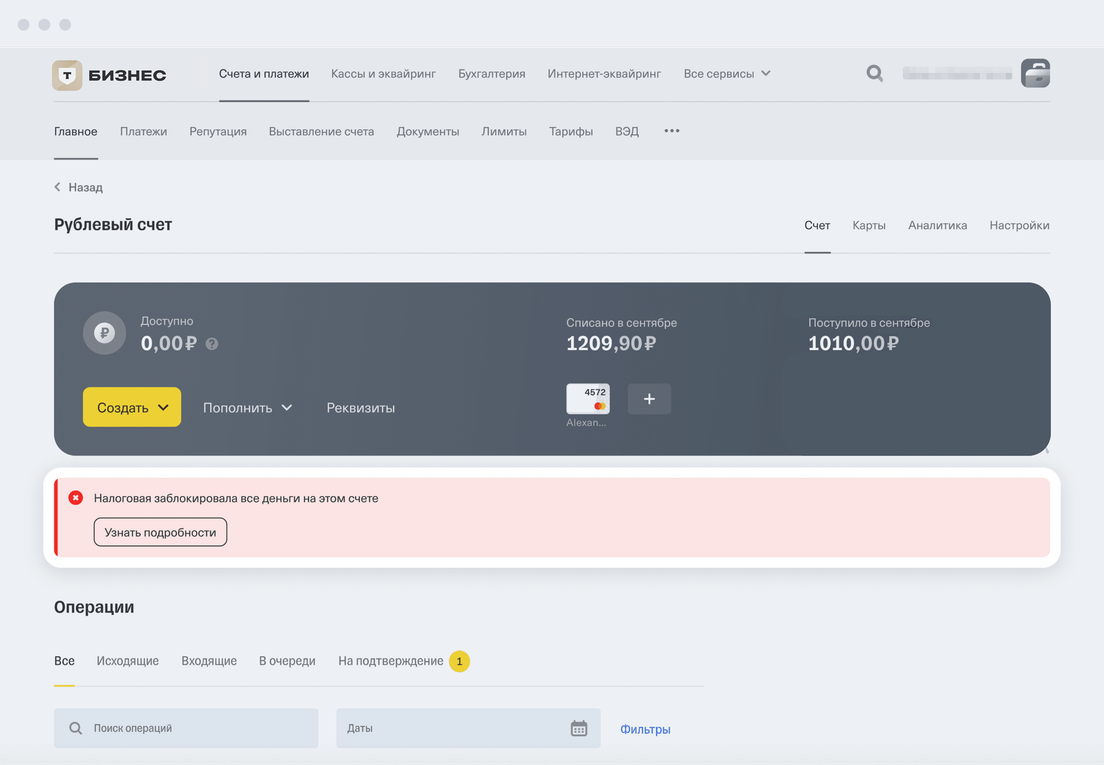 Ваши действия будут зависеть от того, заблокировала ли налоговая определенную сумму или все деньги на счете. Чтобы узнать это, в приложении или личном кабинете Т‑Бизнеса нажмите на счет, около которого есть уведомление о блокировке.