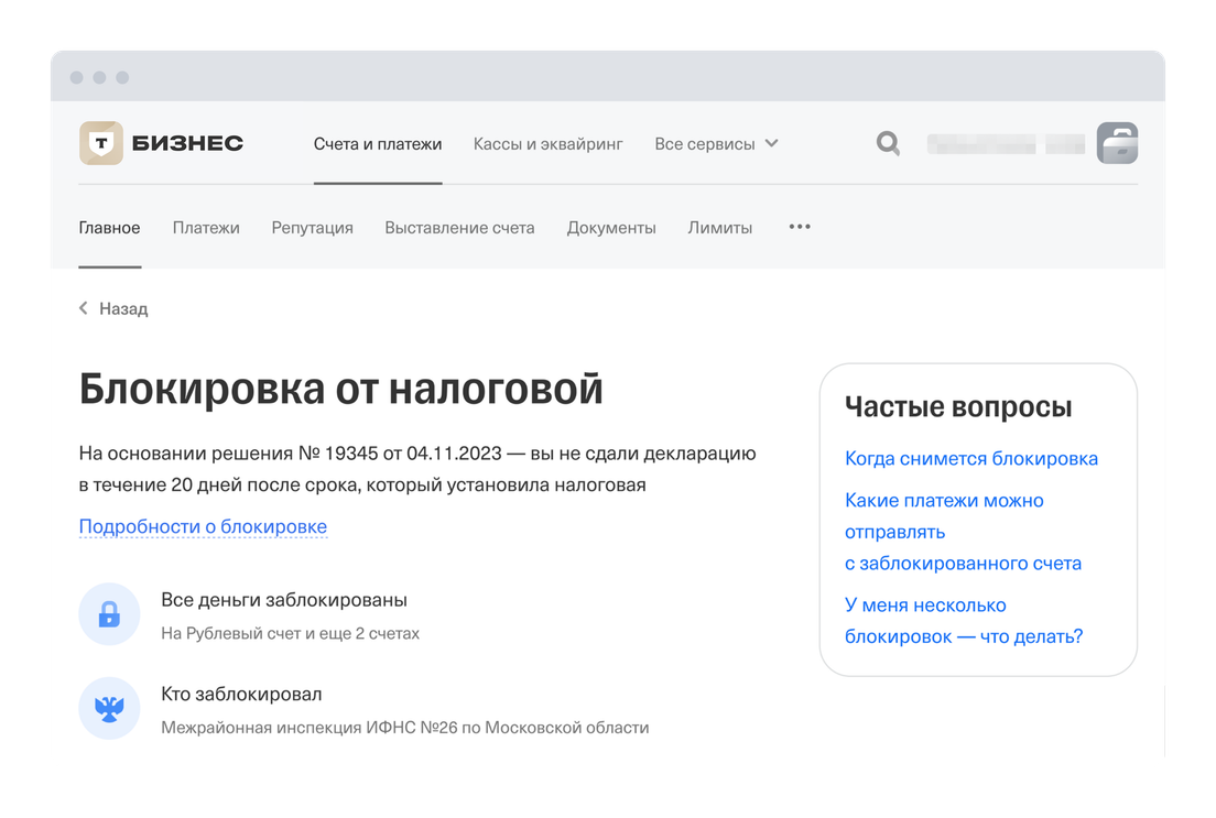Узнать причину блокировки можно в мобильном приложении, личном кабинете Т‑Бизнеса и налоговой.
