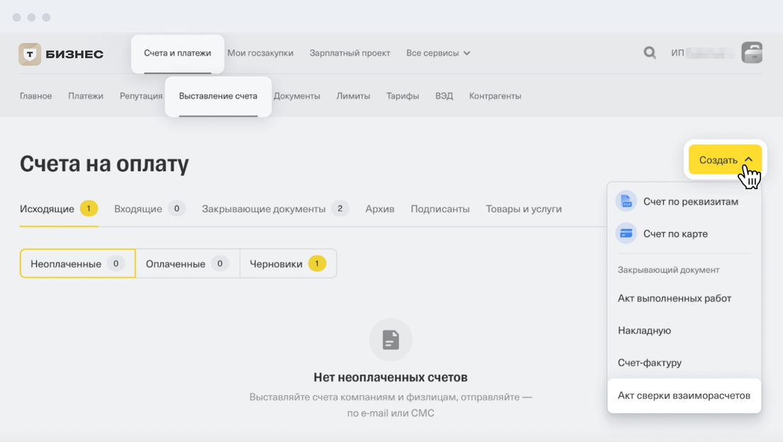 Акт сверки можно создать только в личном кабинете Т‑Бизнеса. Перейдите в раздел «Выставление счета» → кнопка «Создать» → «Акт сверки взаиморасчетов».
