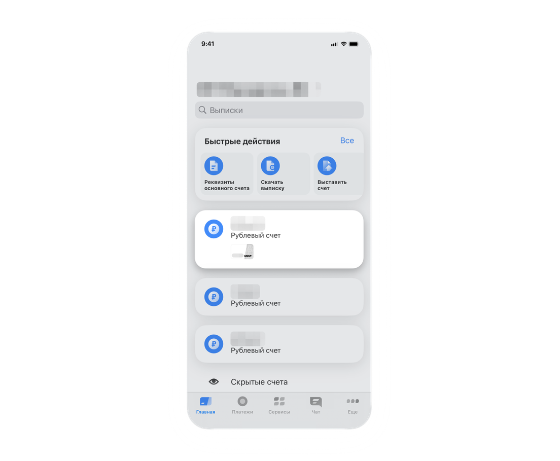 Выберите счет на главном экране, пролистайте вниз до блока «Реквизиты» → «Показать все». Откроется экран с реквизитами, откуда их можно отправить контрагентам. Как отправить реквизиты контрагентам