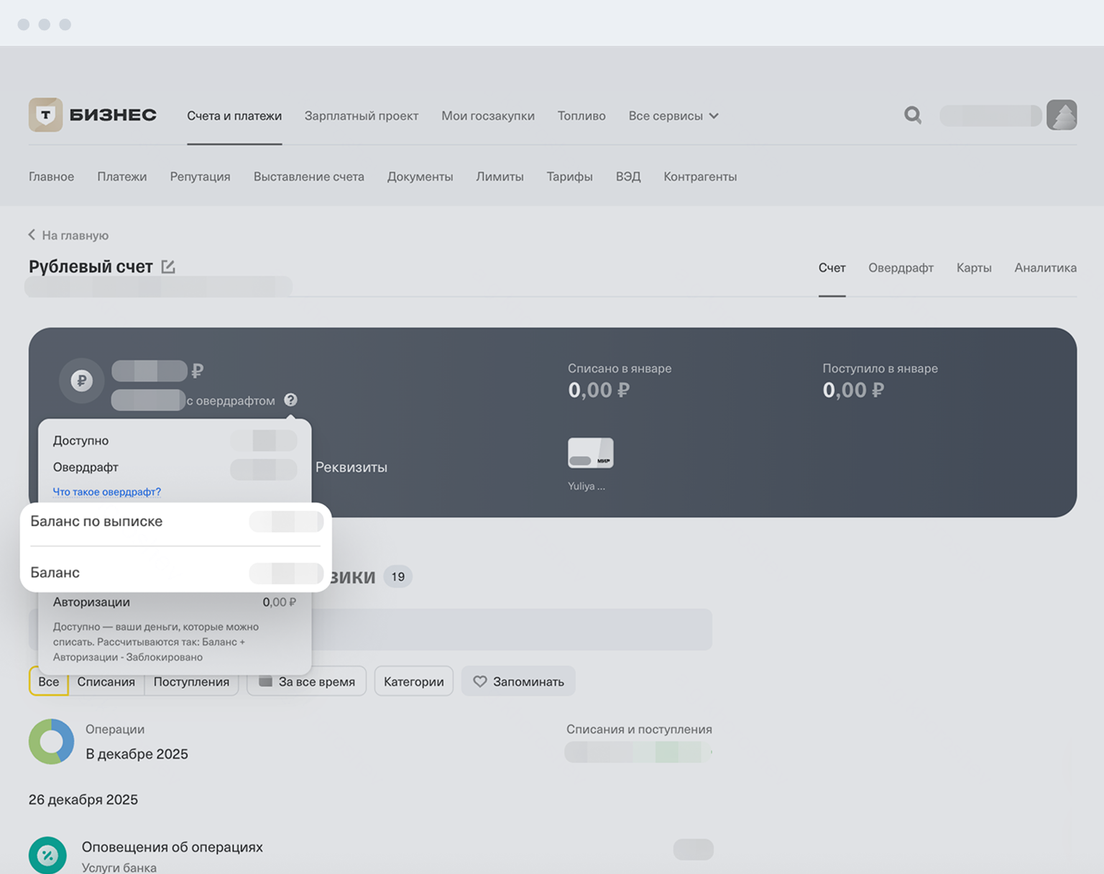 Это разные показатели, которые дают более полную информацию о состоянии счета. В Т-Бизнесе можно посмотреть доступный остаток, баланс и баланс по выписке. Баланс и баланс по выписке — в личном кабинете Т-Бизнеса на сайте tbank.ru, доступный остаток — в приложении и личном кабинете.