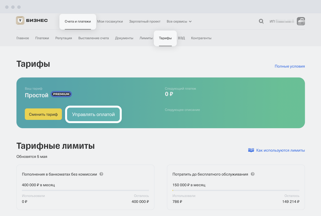 Нажмите на название компании или ИП → «Тарифы» → «Управлять оплатой».