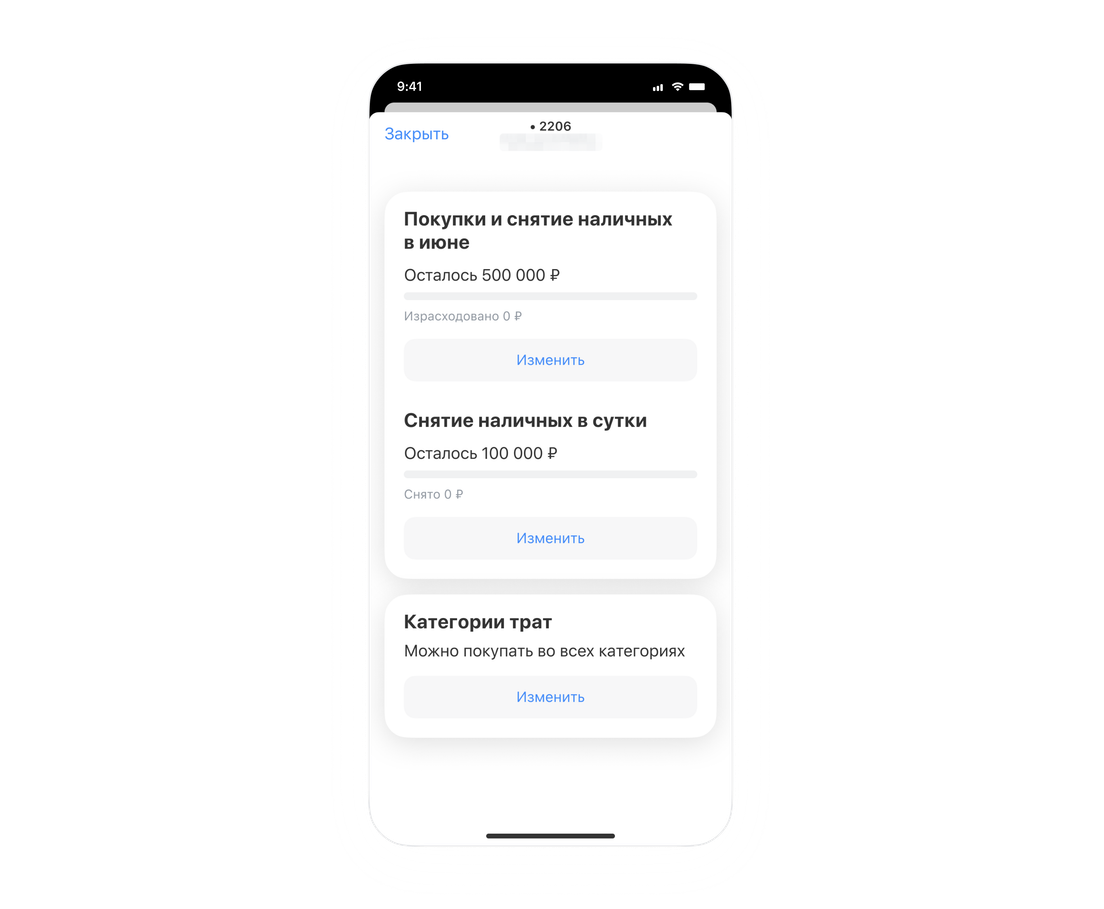 Выберите, что хотите настроить: месячный лимит на покупки и снятие наличных, суточный лимит на снятие наличных или категории трат → «Изменить».