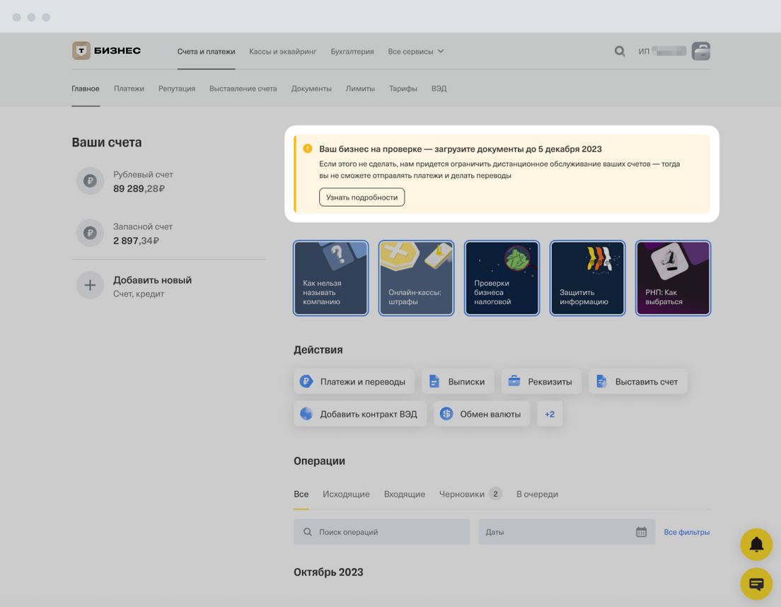В личном кабинете с компьютера вы увидите баннер с информацией о проверке — он будет вверху главной страницыВ приложении вы увидите уведомление о проверке — оно будет над списком расчетных счетовВ личном кабинете на мобильном телефоне вы увидите баннер с информацией о проверке — он будет под списком расчетных счетов