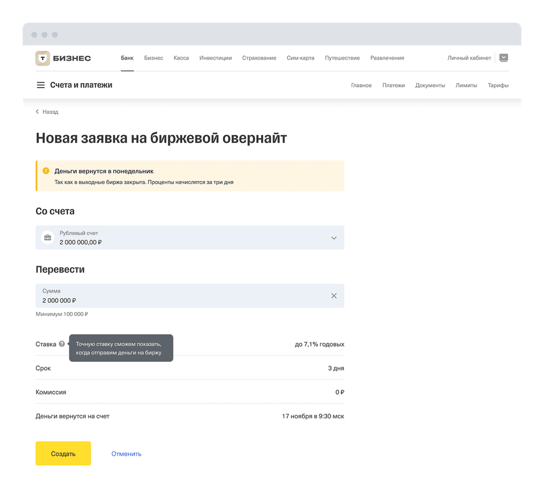 Чтобы увидеть детальную информацию по биржевому овернайту, выберите ее в личном кабинете Т‑Бизнеса в разделе «Ваши овернайты»