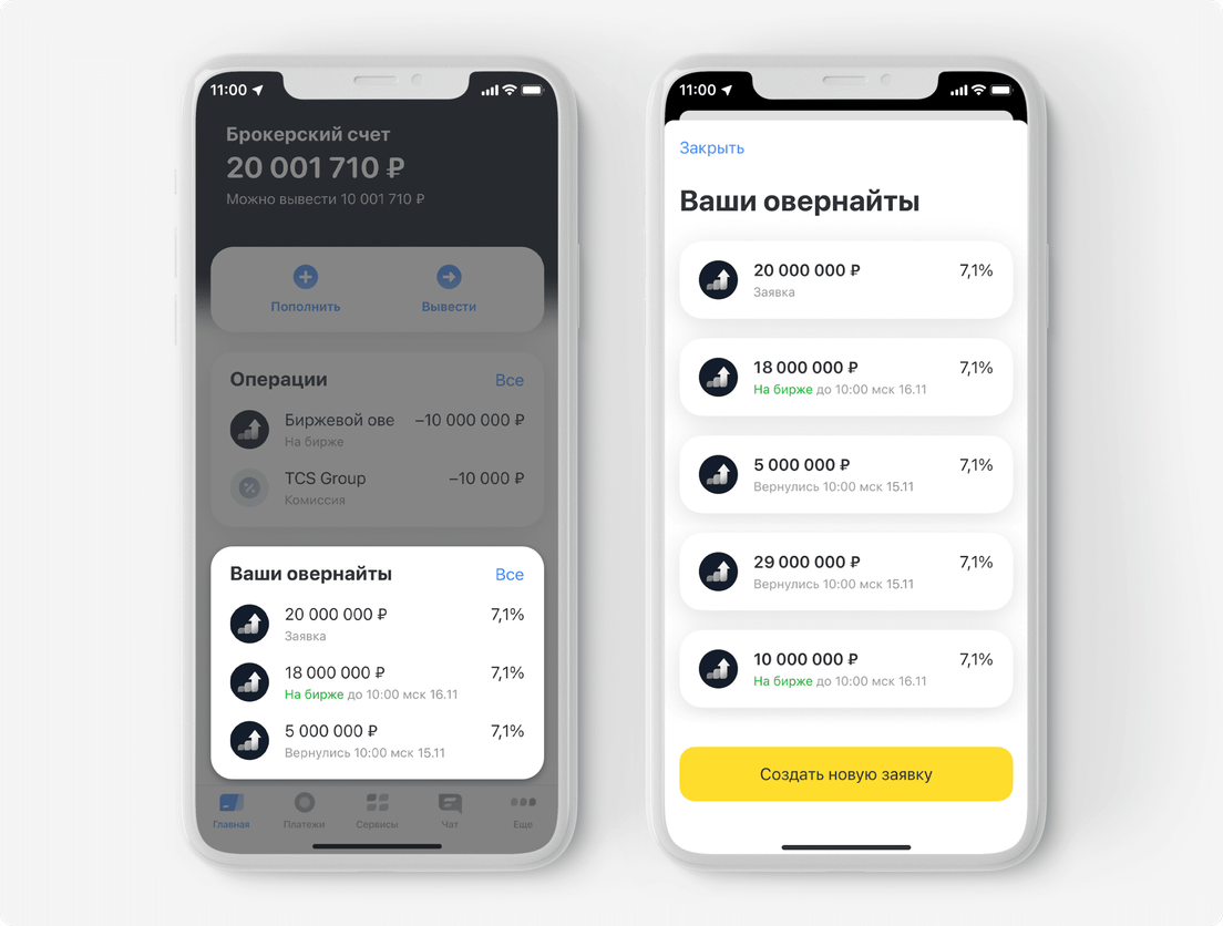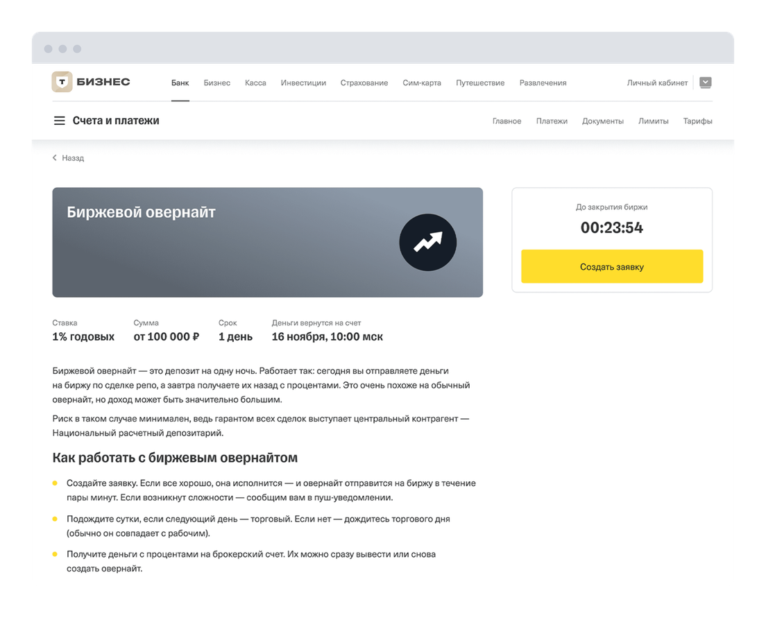 Разместить деньги на биржевом овернайте можно через мобильное приложение или личный кабинет Т‑Бизнеса.