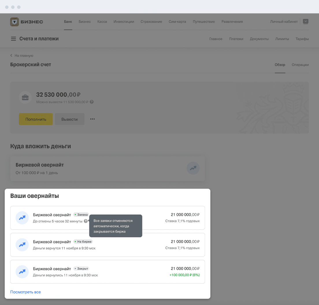 Детальную информацию по всем размещениям можно посмотреть в разделе «Ваши овернайты» на главной странице брокерского счета в приложении или личном кабинете Т‑Бизнеса.