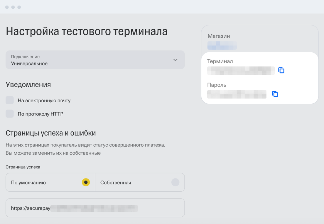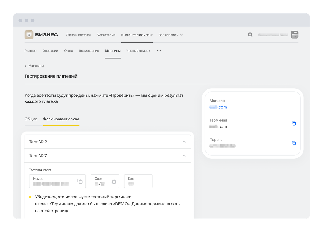 Проведите все тестовые платежи в разделе «Общие»: выберите любой товар на сайте и следуйте инструкциям, которые указаны в тестах. Для прохождения тестов скопируйте данные тестового терминала справа вверху.