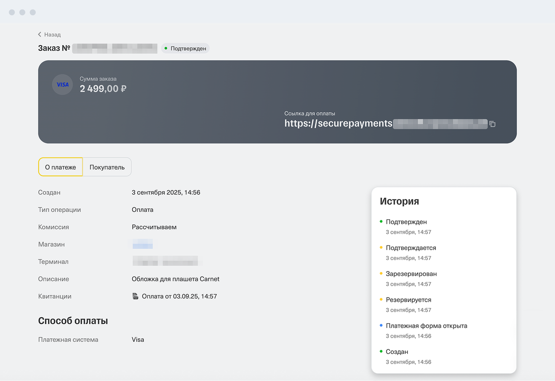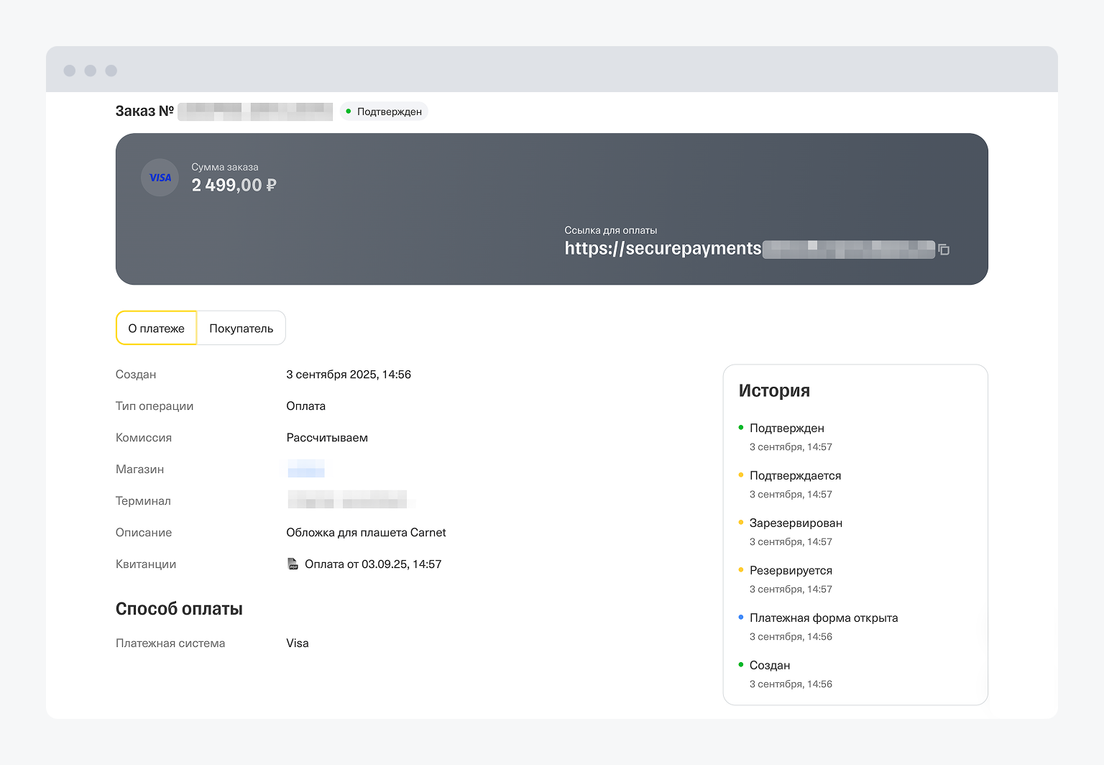 Если у вас платежная ссылка, работайте с платежами в личном кабинете интернет-эквайринга → «Счета».