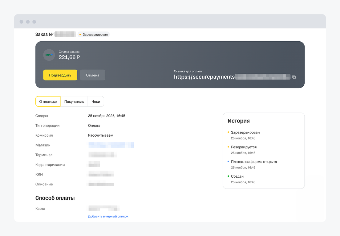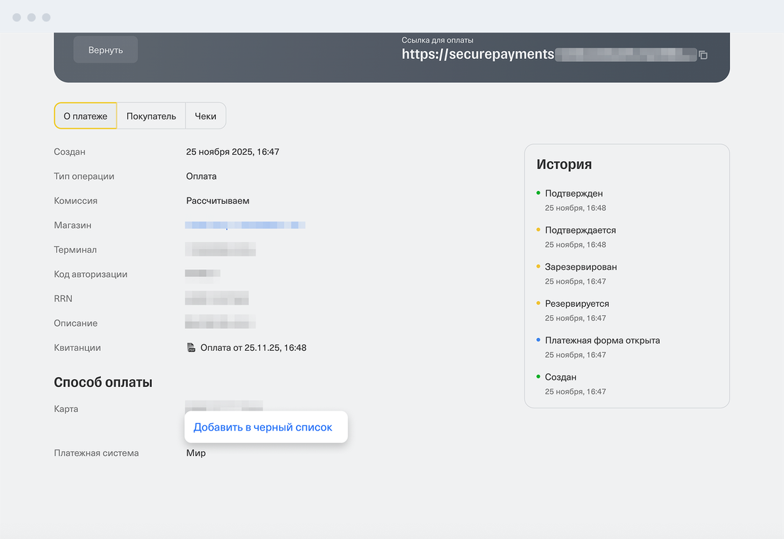 И с платежной формой, и с платежными ссылками вы можете отслеживать статусы платежей, смотреть аналитику по оплатам и вносить карты покупателей в черный список. Как это делать
