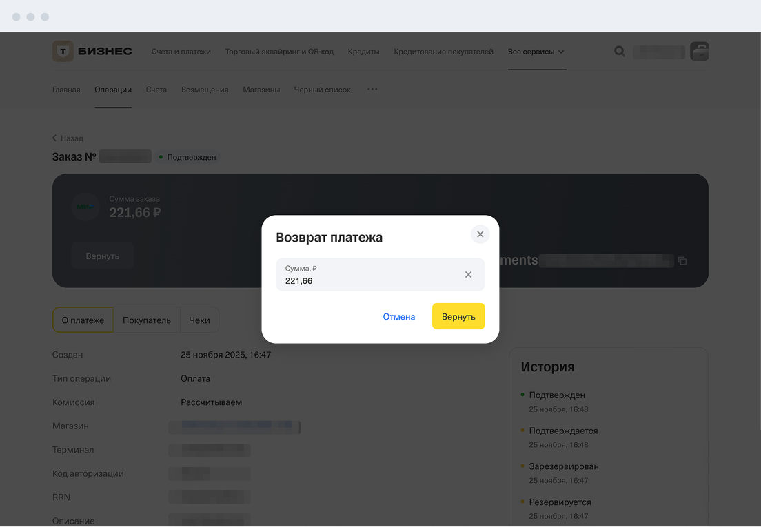 Когда сделаете возврат и деньги поступят на счет покупателя, у платежа появится статус «Возвращен полностью» или «Возвращен частично». Посмотреть статус платежа можете в личном кабинете интернет-эквайринга → «Операции». Перейти в раздел «Операции»
