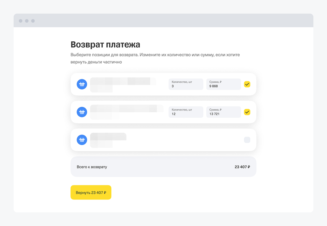 Поставьте галочки на позициях, которые хотите вернуть. Укажите количество или сумму, если хотите вернуть часть денег.