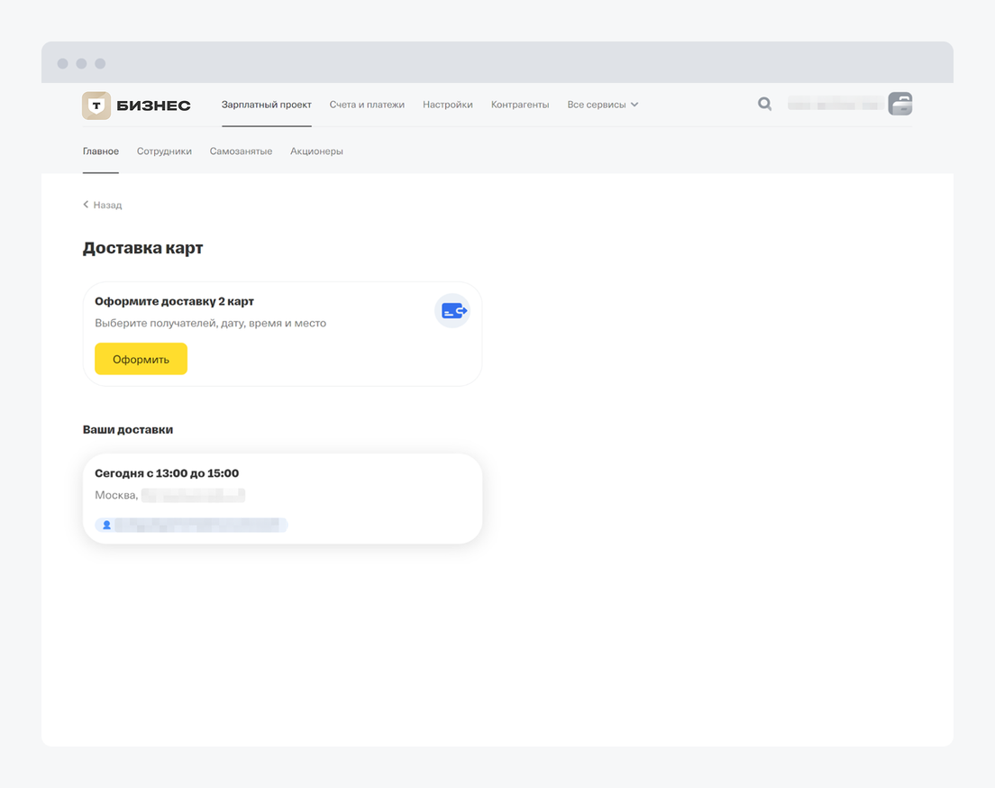 После того как самозанятый выберет место и время доставки, его фамилия появится в разделе «Зарплатный проект» → «Доставка карт» → «Ваши доставки».
