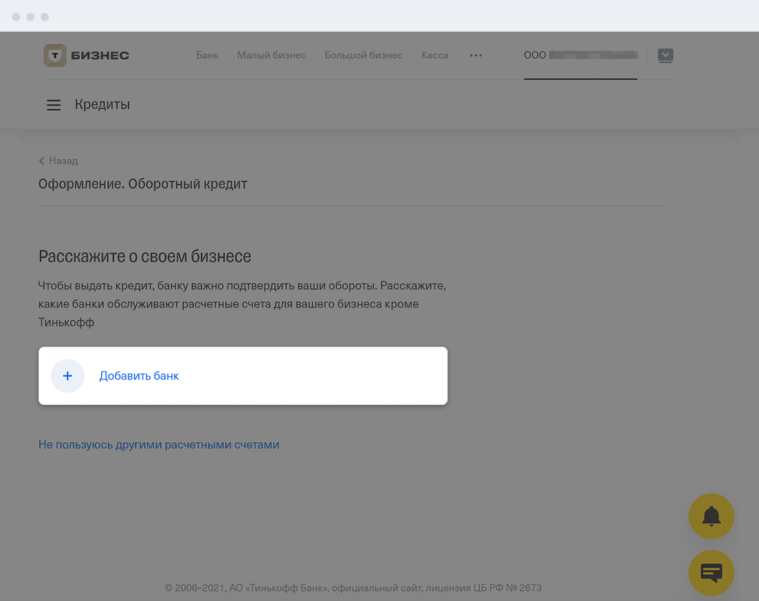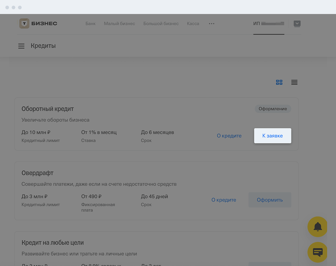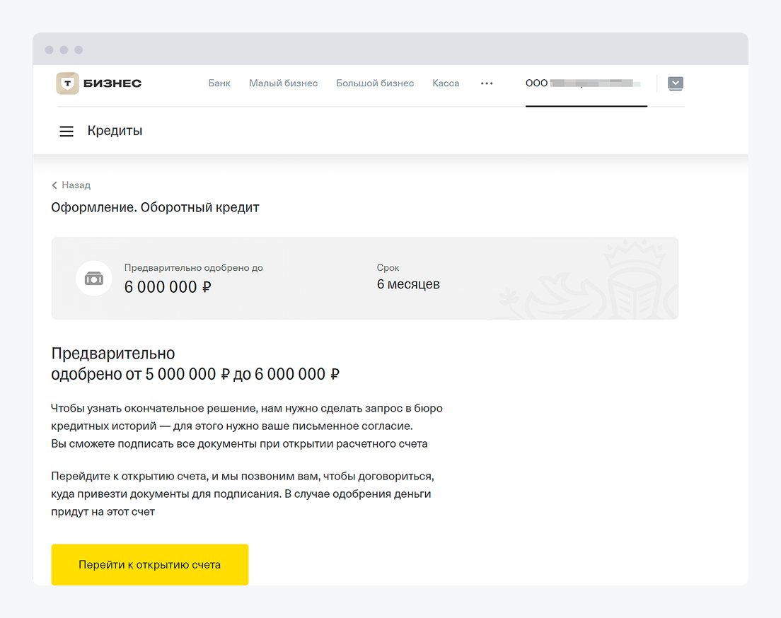 Дождитесь предварительного решения. Когда кредит предварительно одобрят, мы пришлем СМС. Еще вы увидите уведомление в разделе «Бизнес» → «Кредиты».