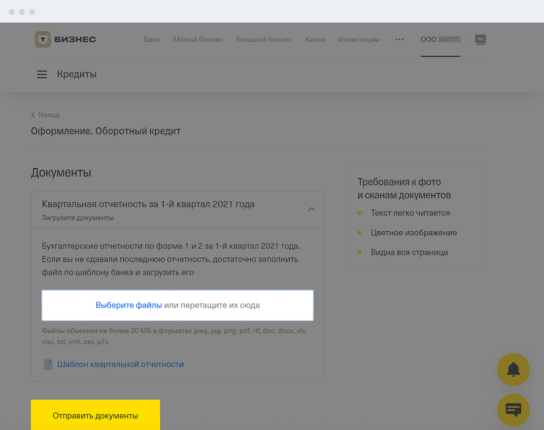 Документы можно загрузить в разделе «Бизнес» → «Кредиты».