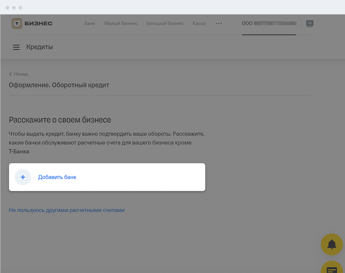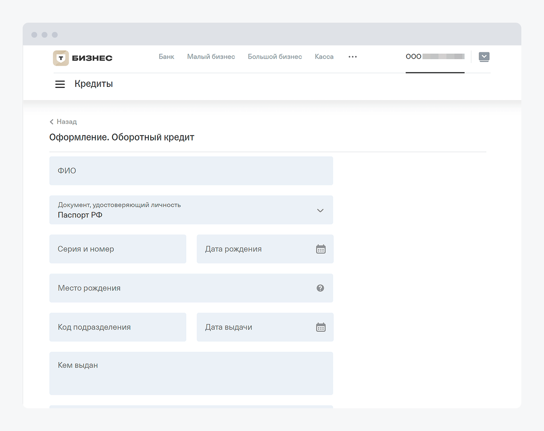 Если у вас еще нет счета в Т‑Банке, заявку на оборотный кредит рассматриваем от одного дня. Если возникнут вопросы или потребуются дополнительные документы, срок проверки может увеличиться до недели.