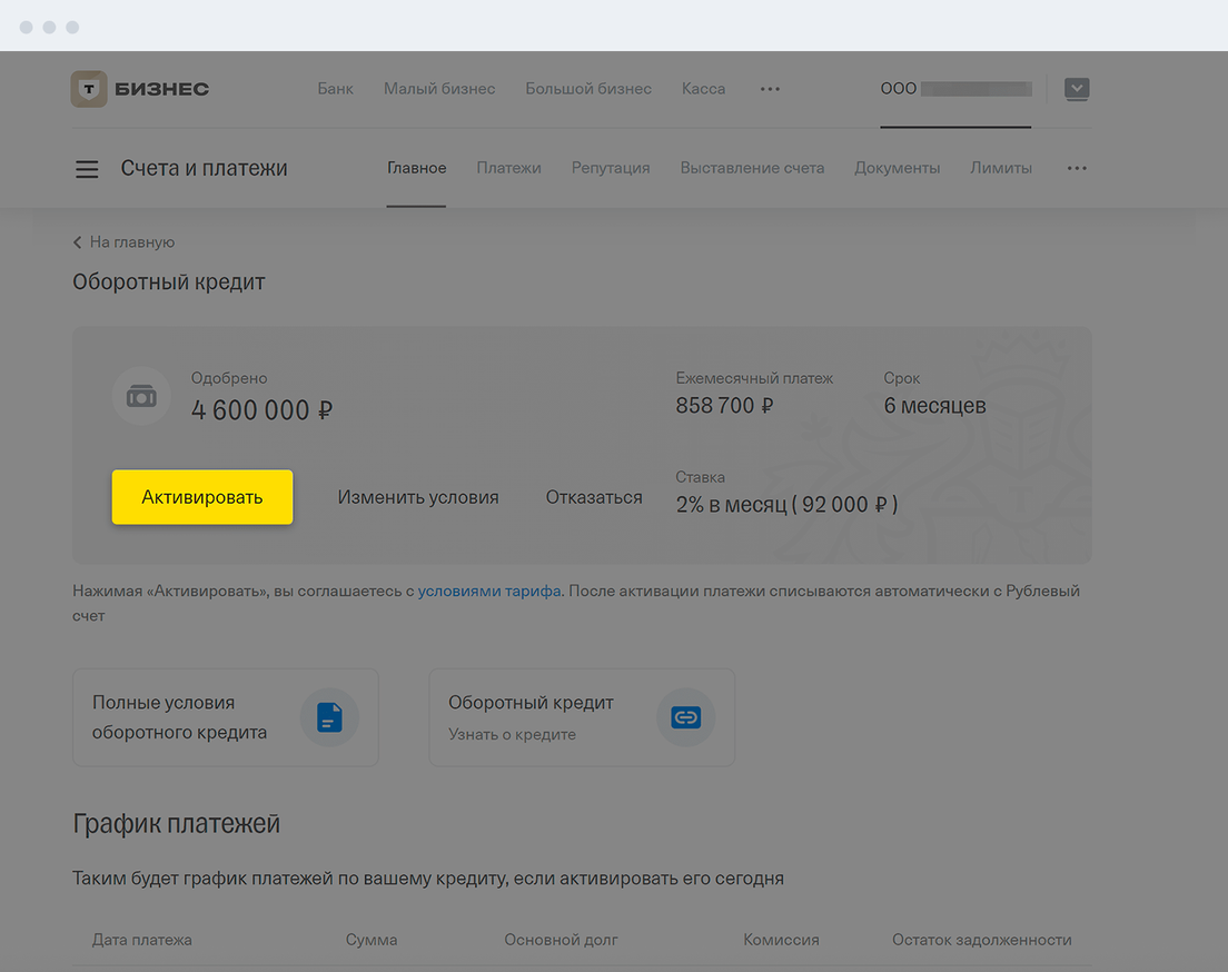 Активируйте кредит. Для этого нажмите кнопку «Активировать» в личном кабинете. После активации платежи начнут списываться с вашего расчетного счета по графику.