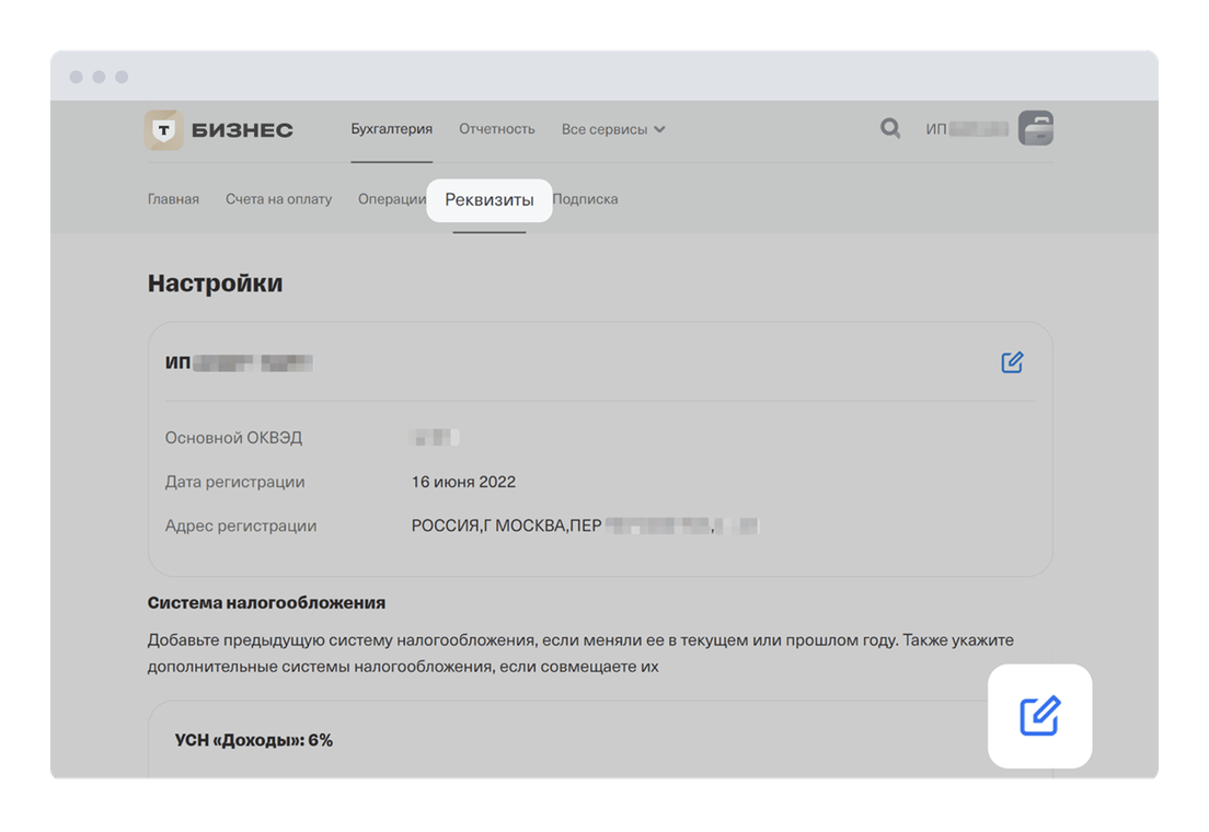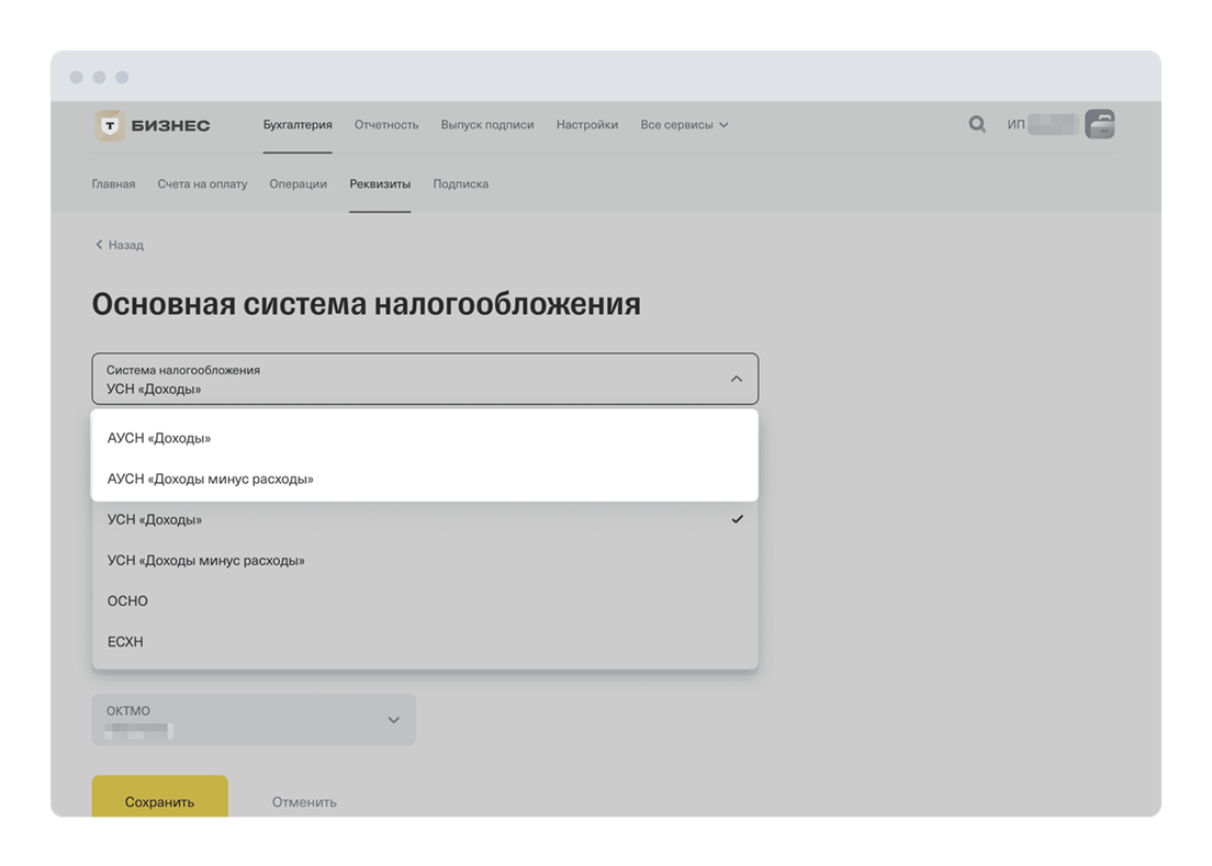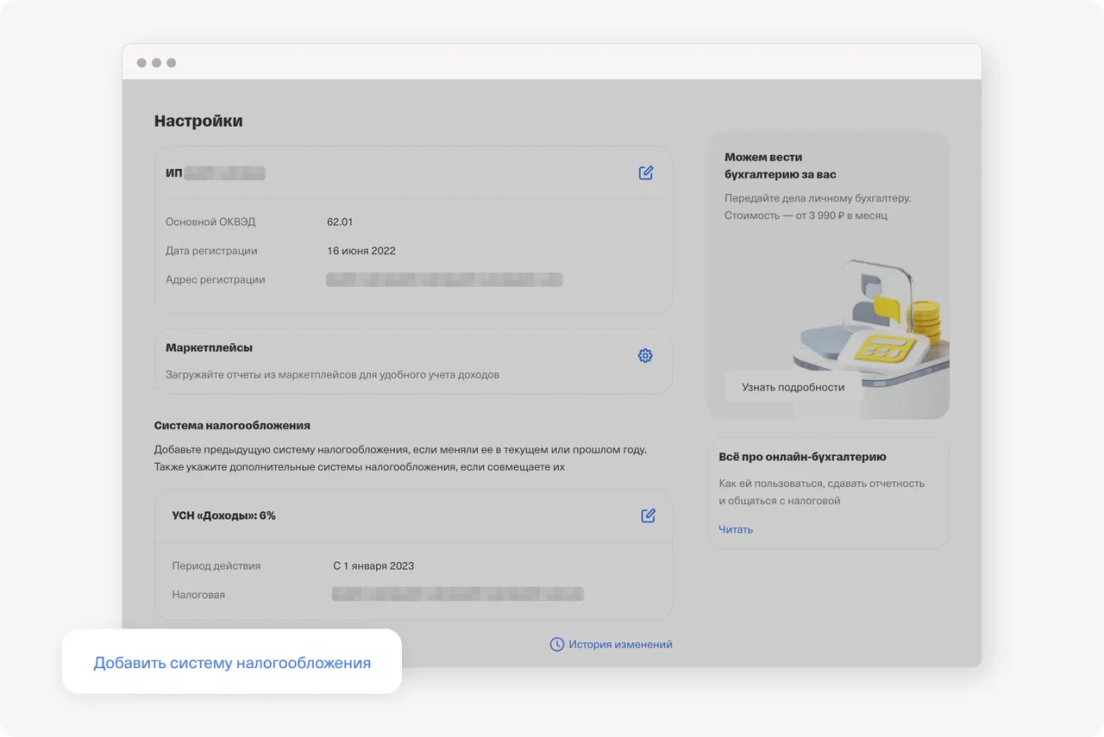Если вы оформите ИП на УСН «Доходы» и откроете расчетный счет в Т‑Бизнесе, сможете бесплатно пользоваться онлайн-бухгалтерией. Сервис поможет рассчитать и уплатить налоги и взносы, а также подать декларацию. Подробнее об онлайн-бухгалтерии