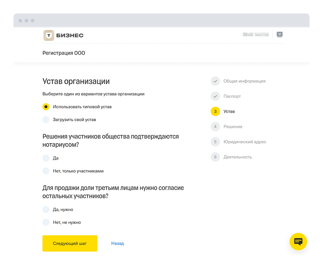 При регистрации ООО через Т-Банк предложим подобрать типовой устав или загрузить свой.