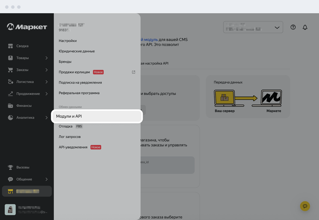 Откройте боковое меню, нажмите на название вашего магазина в левом нижнем углу → «Модули и API».