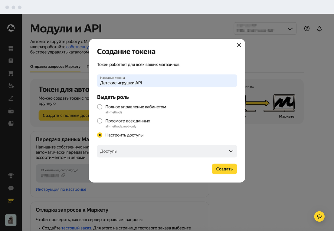 В поле «Название токена» введите любое слово или фразу, например название вашего магазина или «ключ API для Т-Банка». Выберите «Настроить доступы».