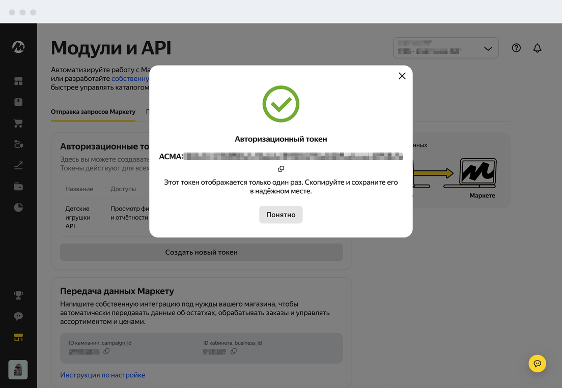 Готово, вы получили ключ API. Вернитесь в личный кабинет Т-Бизнеса и продолжите подключение интеграции Яндекс Маркета в онлайн-бухгалтерии. Продолжить подключение интеграции