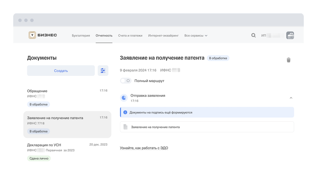 Готово! Отправленное заявление появится на вкладке «Отчетность» в колонке «Документы». Под названием заявления на цветном поле будет указан его актуальный статус. Чтобы посмотреть ответ налоговой, когда он поступит, кликните на название заявления в колонке «Документы». Обычно налоговая обрабатывает документы в течение трех рабочих дней.