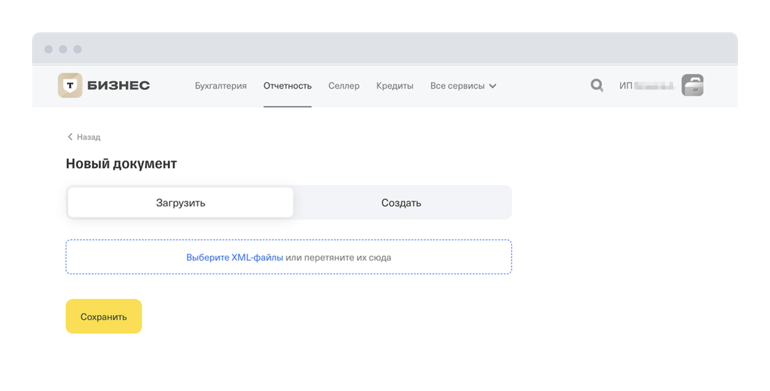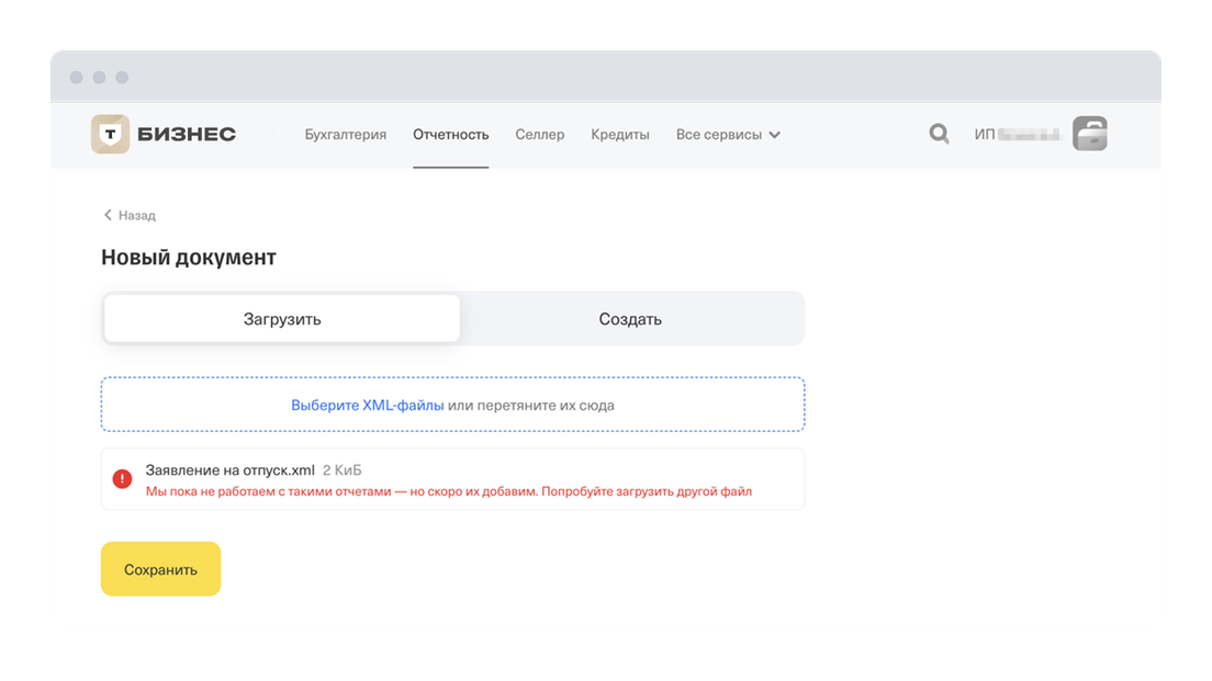 Документы должны быть в формате xml. Если попробуете загрузить документы в другом формате, сервис выдаст ошибку.