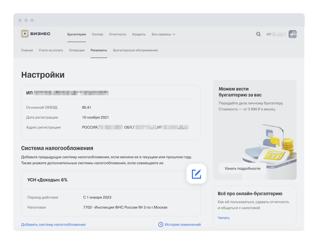 В блоке «Система налогообложения» нажмите на значок редактирования.