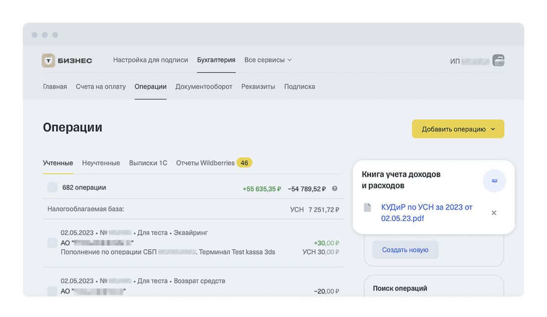 Скачать книгу можно в любой момент в личном кабинете Т‑Бизнеса. Для этого перейдите в раздел «Бухгалтерия» → «Операции» и кликните по книге учета доходов и расходов, чтобы скачать ее на компьютер.