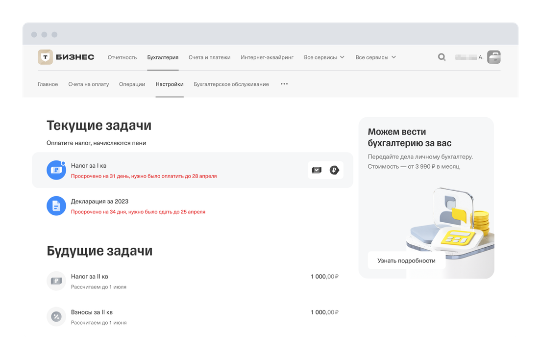 Чтобы подать налоговое уведомление и внести авансовый платеж, зайдите в личный кабинет Т‑Бизнеса → «Бухгалтерия». Нажмите на задачу «Налог за I, II или III кв». Подробная инструкция по уплате налога