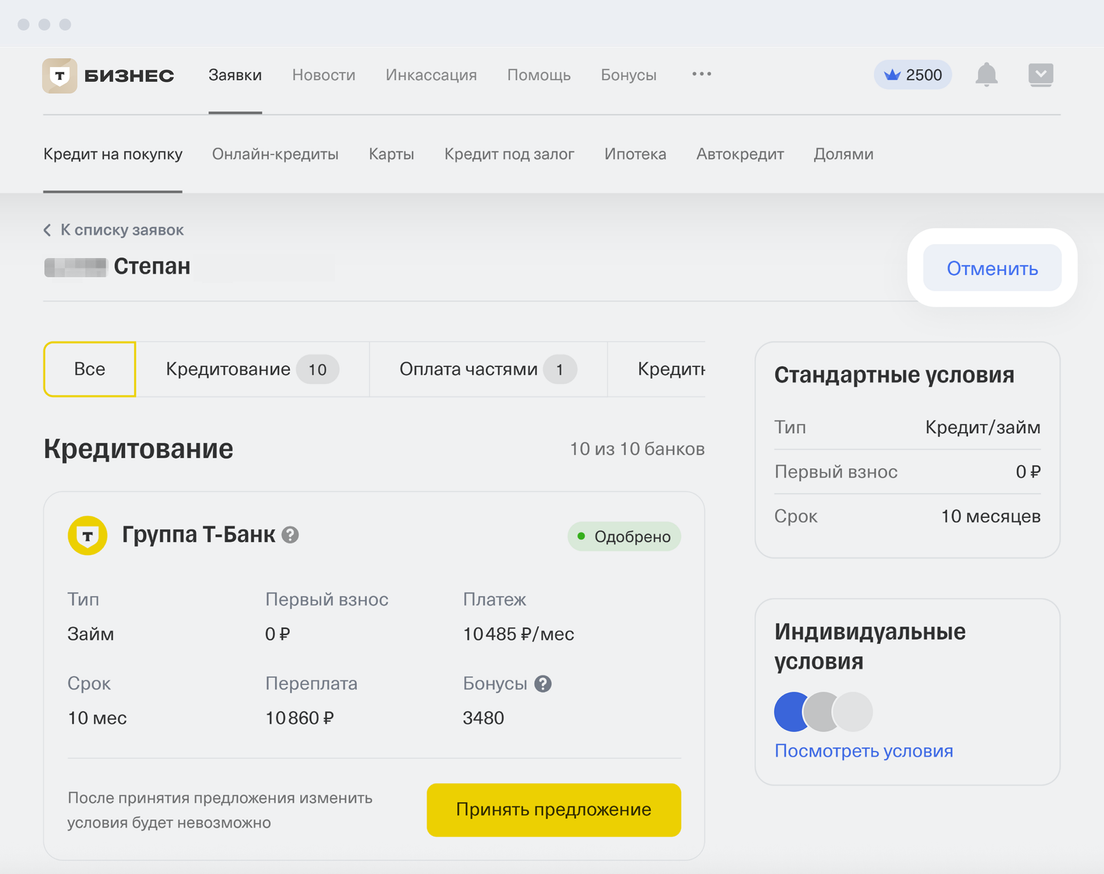 До выбора кредитного предложения. Нажмите «Отменить» справа вверху. Выберите причину отмены и напишите комментарий → «Отменить заявку».