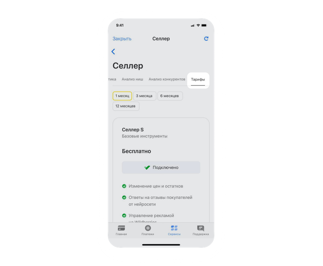При переходе с любого платного тарифа на «Селлер S» или с тарифа «Селлер М» на «Свой тариф» новый тариф подключится после того, как закончится оплаченный период старого. До этого момента вы сможете пользоваться платными функциями.