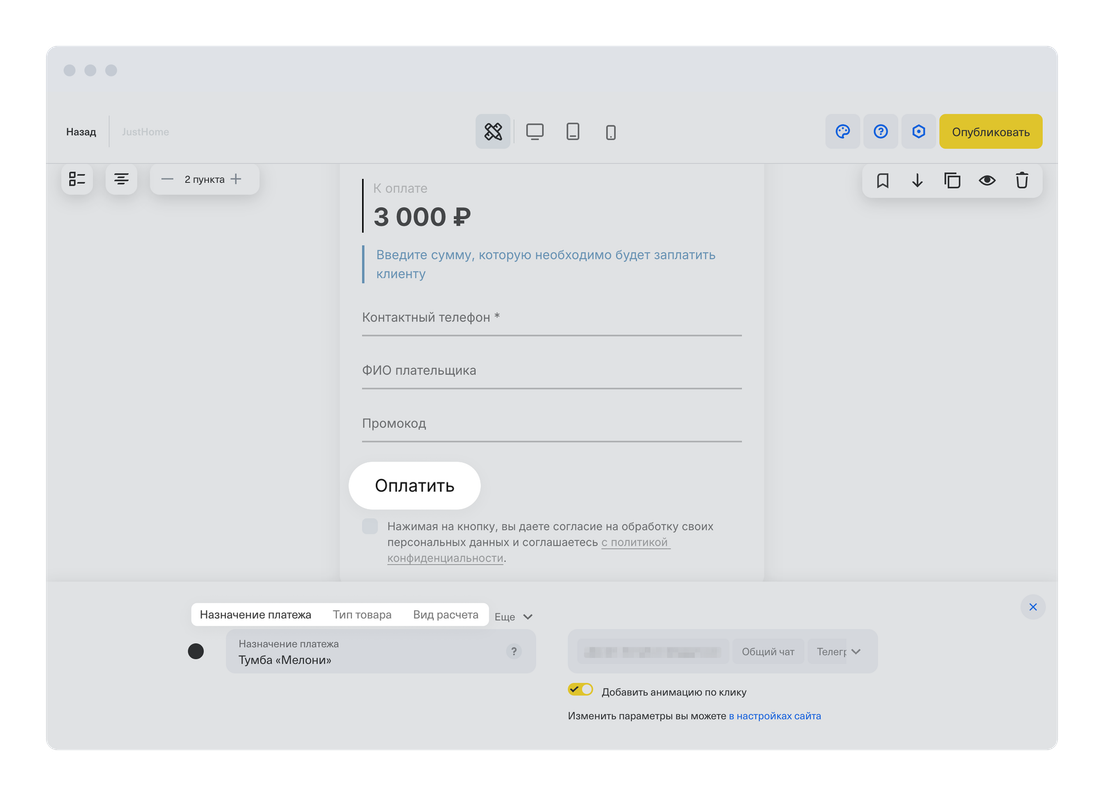 Нажмите «Опубликовать» справа вверху. Осталось настроить переход с платежной формы на страницу успеха.