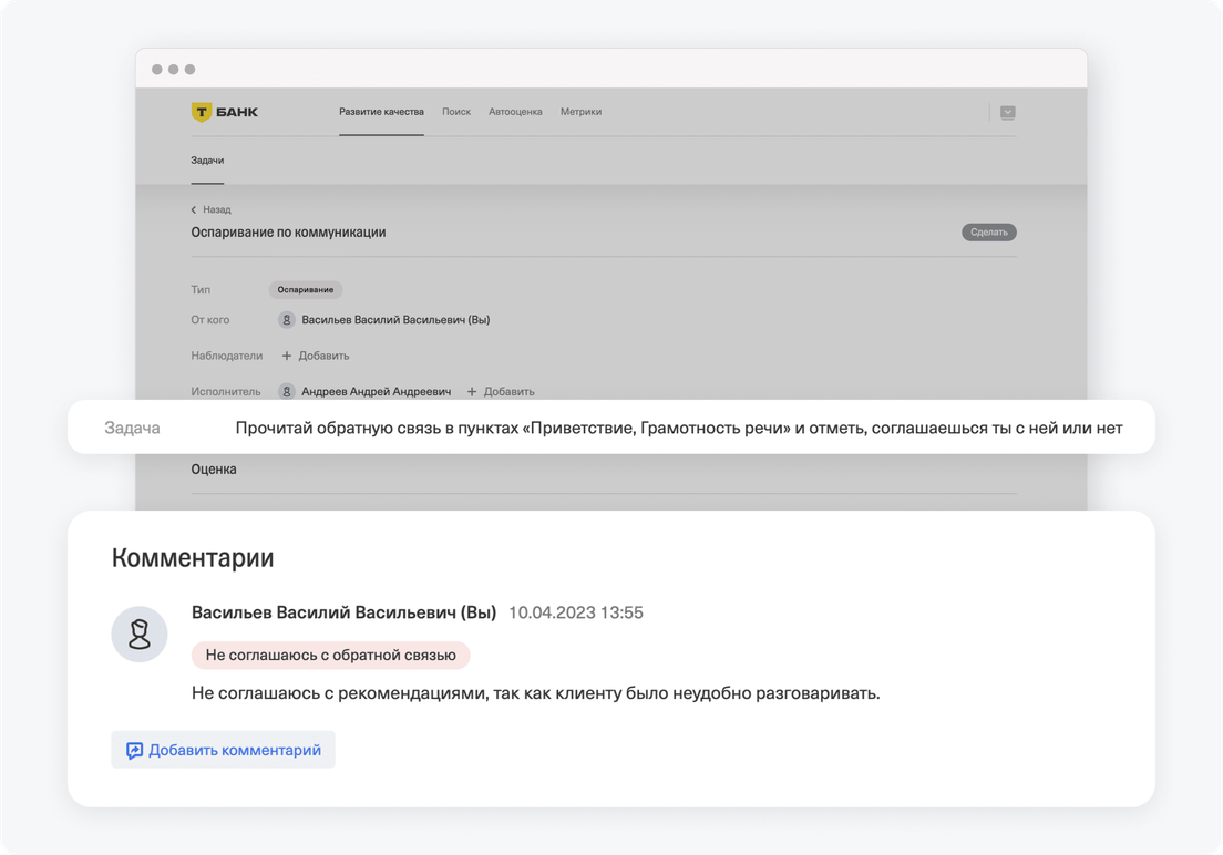 В блоке «Комментарии» можно посмотреть историю обратной связи: согласие или оспаривание оценки. Участники могут передавать задачу друг другу, пока кто‑то из них не согласится с результатом оспаривания. Исполнителем будет тот сотрудник, кому назначена задача.