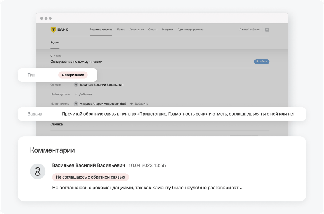 Задача может передаваться от оценщика оператору и обратно. Исполнителем будет тот сотрудник, кому передана задача. Перевод задачи между участниками будет происходить, пока кто‑то из участников не согласится с результатом оспаривания.