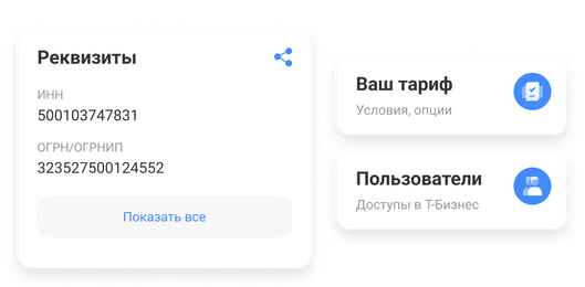 На одной вкладке: тарифы, лимиты, доступы для сотрудников, реквизиты для быстрой отправки контрагентам и заказ справок