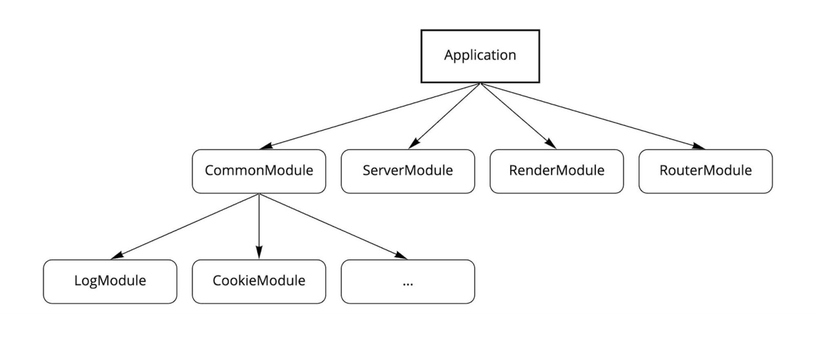 Модули могут подключать любые другие модули, выстраиваясь в общее дерево зависимостей.