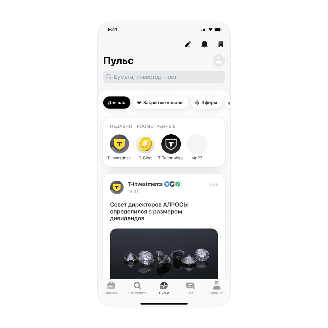 Как найти все каналы: в приложении Т‑Инвестиций на нижней панели нажмите на вкладку «Пульс» → кнопка «Каталог» под строкой поиска.