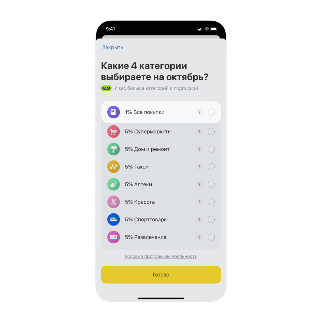 Категория «1% на все покупки» будет в списке категорий всегда, другие будут каждый раз новые, как и раньше. Выбирать теперь вы будете из семи категорий, а если есть подписка Pro — из восьми.