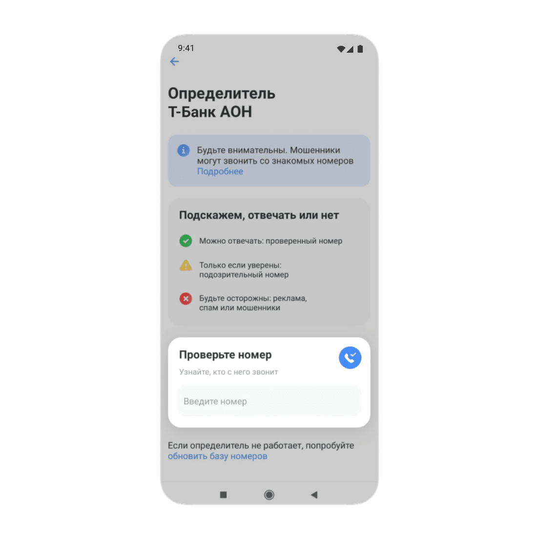 Определитель Т‑Банк показывает информацию только по тем номерам, которые есть в нашей базе. Она постоянно обновляется и пополняется с помощью наших моделей машинного обучения, которые разработаны в Центре экосистемной безопасности Т‑Банк.