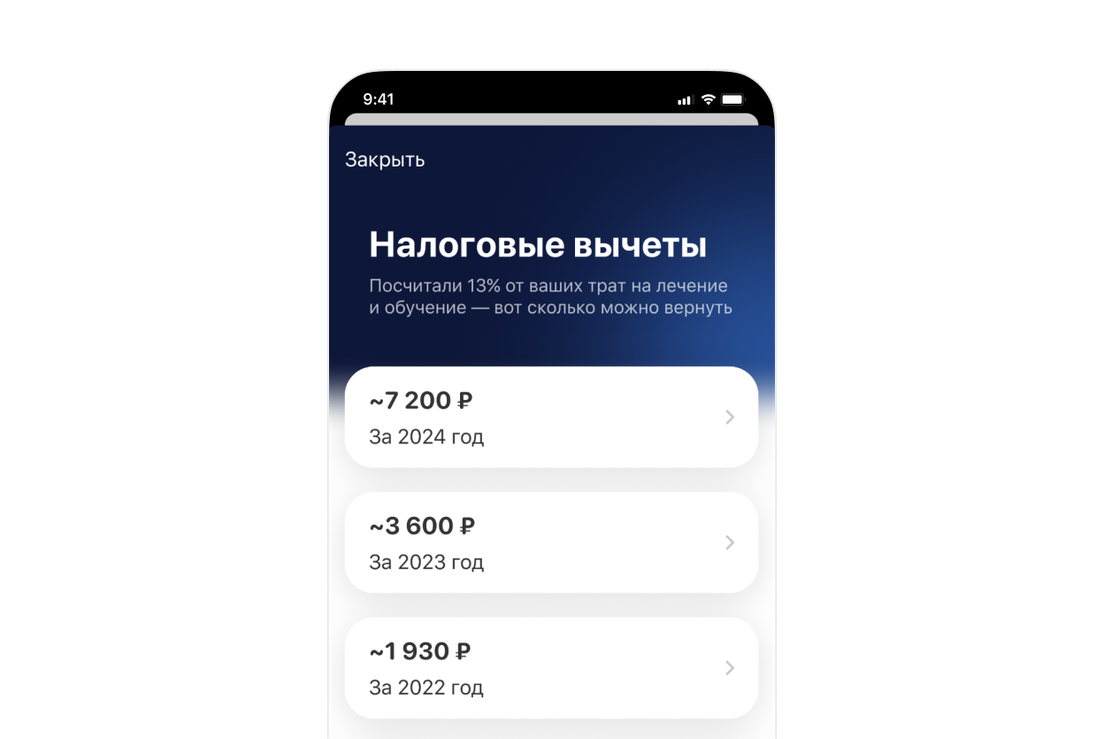 При этом в приложении отображаются все годы, за которые доступны вычеты в 2025-м. Так вы поймете, сколько денег всего можете вернуть, и, если захотите, оформите вычет самостоятельно по нашей инструкции.