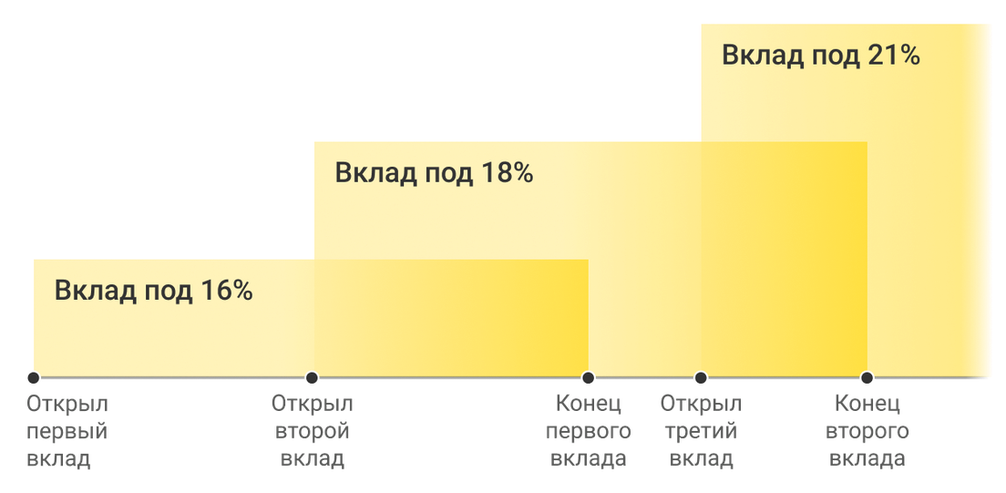 Через два месяца ставки снова выросли. Теперь ставка для годового пополняемого депозита — 21%. Игорь открывает третий вклад и так же кладет на него минимальную сумму.