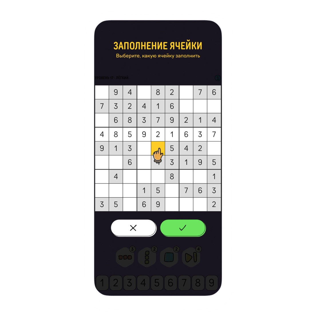 Чтобы заполнить клетку, нажмите на нее, а затем выберите из цифр внизу нужную.